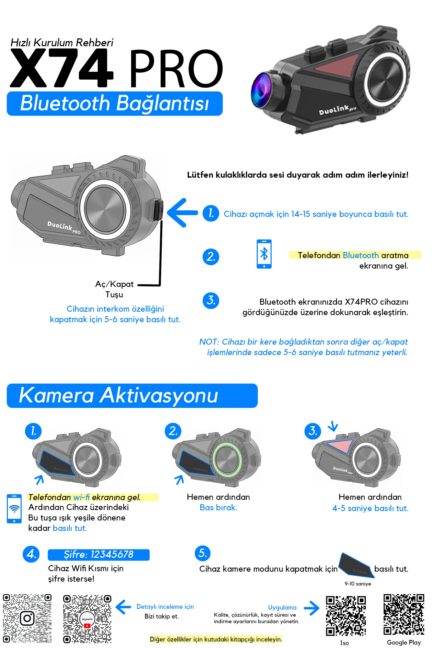 DuoLink X74 Pro İnterkom Motosiklet Kameralı 360° Modül 6 Kişi Bluetooth Kask Intercom Video Kayıt Kulaklık